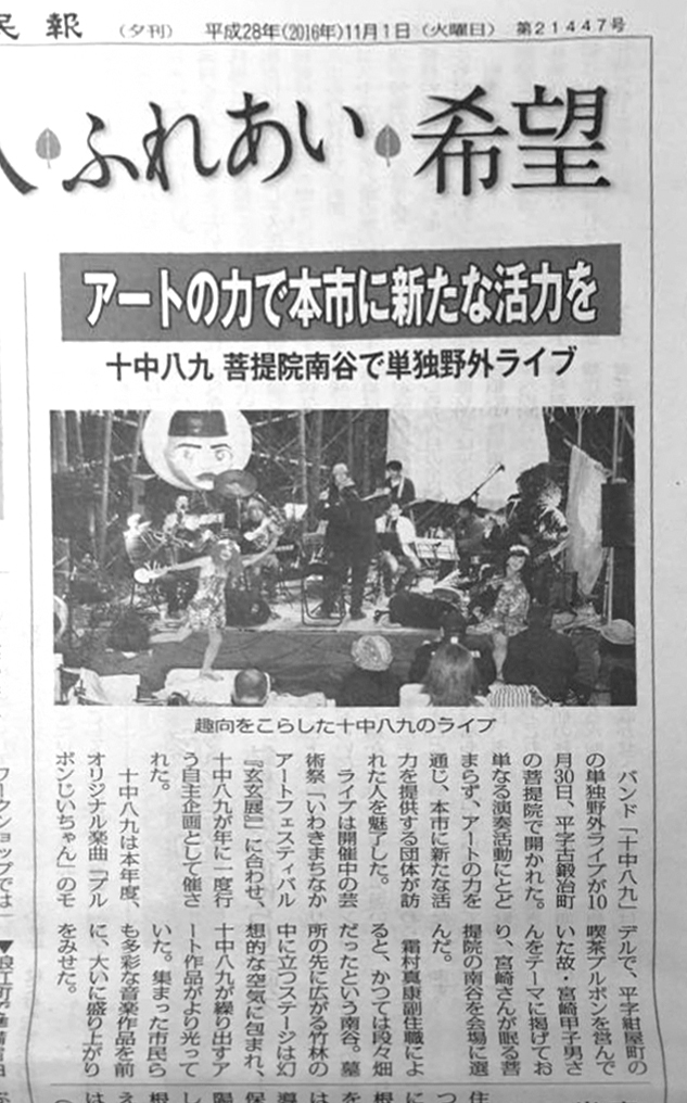 地元いわきの夕刊、いわき民報さんの何と一面にバンド十中八九の記事を掲載していただきました。新聞オンラインにて全国津々浦々からもご覧いただけます。